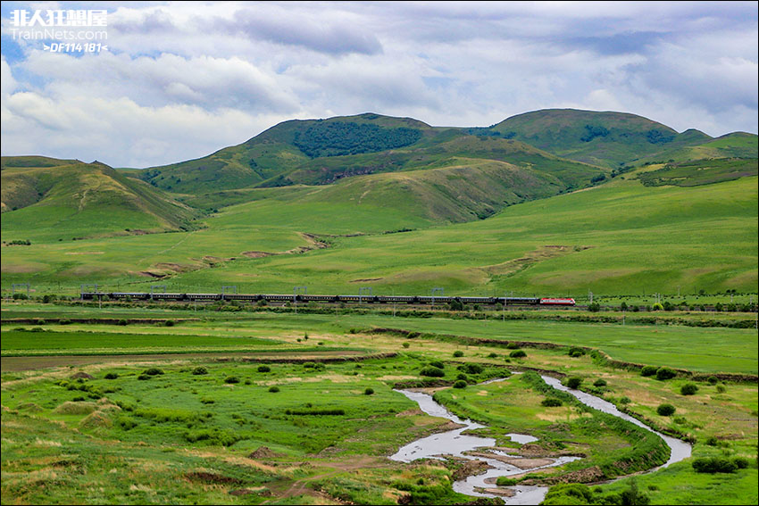 2023年7月,内蒙古霍林郭勒,通霍线,K7527次列车(大连-珠斯花)通过盛夏的草原,即将终到珠斯花站。