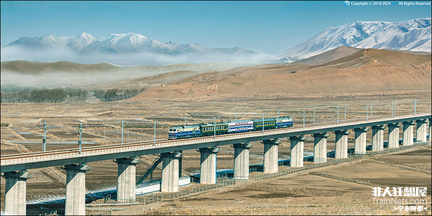 2024年4月8日,祁连山乌鞘岭南麓,联调检测列车行驶在兰张三四线上。