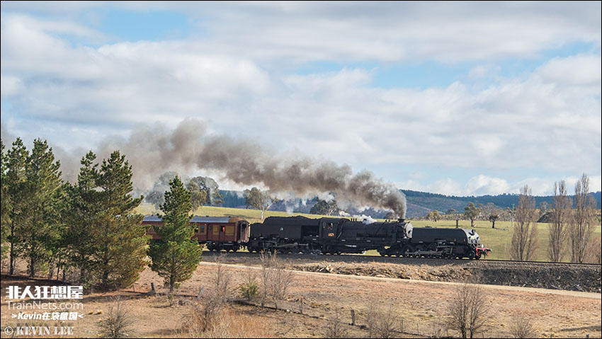 2020年8月。南半球最大的蒸汽机车—— 澳大利亚新南威尔士州铁路博物馆的蒸汽机车6029牵引纪念列车行驶在堪培拉附近的铁路线上。