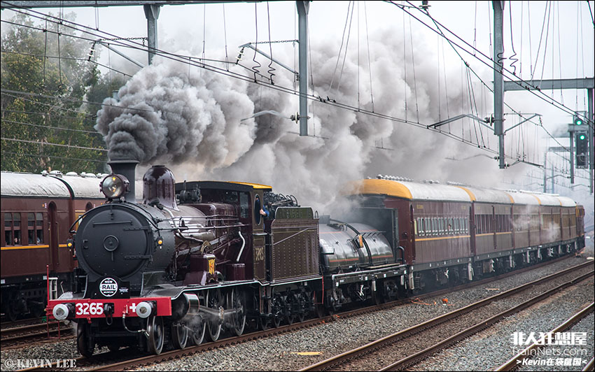 2020年8月。澳大利亚新南威尔士州铁路博物馆的蒸汽机车3265牵引列车行驶在悉尼市区的铁路上。