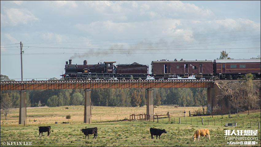 2020年8月。澳大利亚新南威尔士州铁路博物馆的蒸汽机车3265牵引纪念列车驶过悉尼Richmond Line的一座桥。