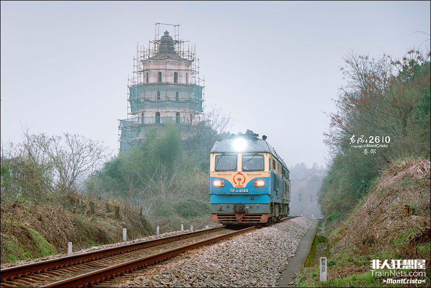 2024年3月17日,湘桂线货车单机驶过正在修缮中的吴公塔。