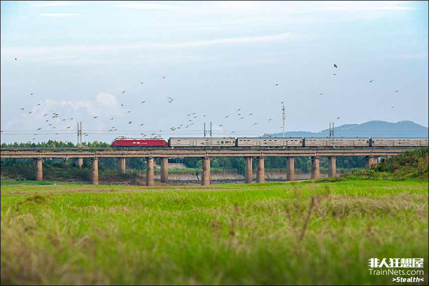 2023年9月18日,湖南岳阳,京广线,HXD1D-0566机车担当的X104次穿过洞庭湖畔的绿茵,与鸟群相伴。