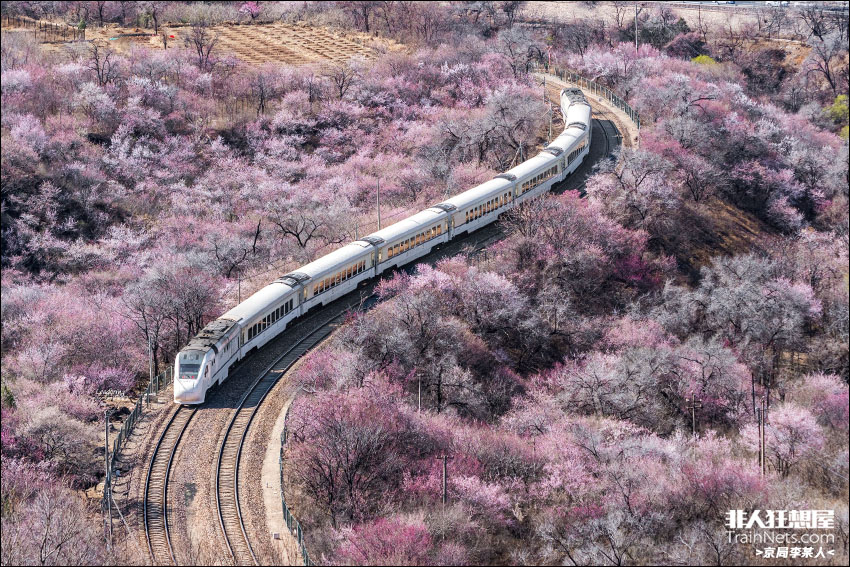 2024初春,北京市郊铁路S2线大白猪缓缓通过关沟栈道,穿越花海。