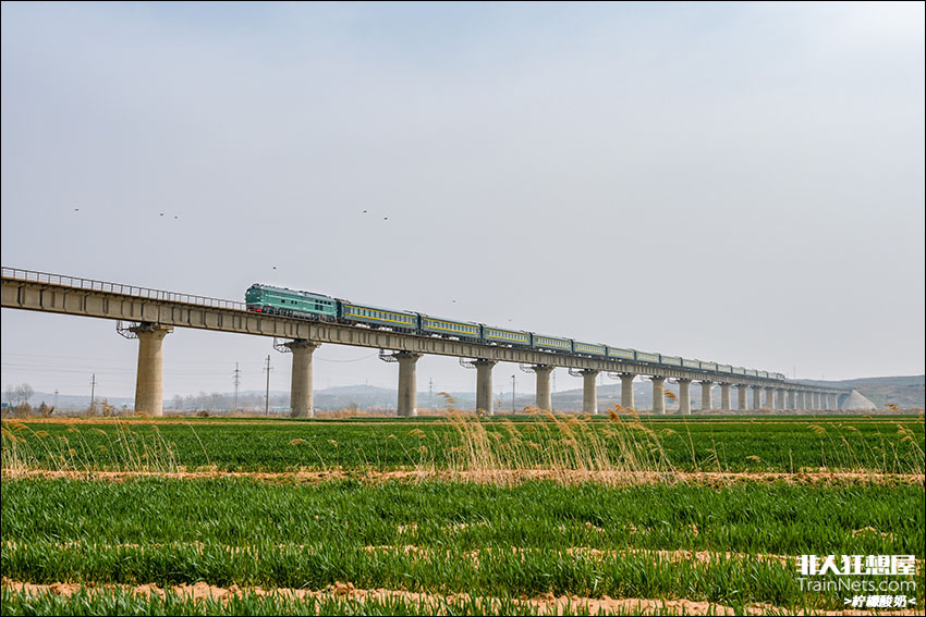 2023年4月10日,沙暴散去,K1066次(威海-武昌)在桃威线的特大桥上隆隆驶过。