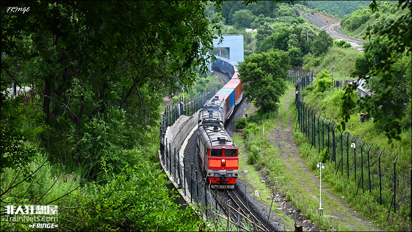 2023年7月末。盛夏的绥芬河口岸,俄铁机车牵引集装箱专列通过S弯驶入绥芬河南货场。