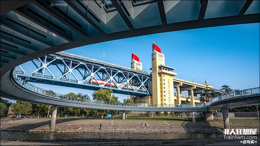 2023年12月。上局沪段SS9G牵引电力X102次穿过南京长江大桥南侧桥头堡。