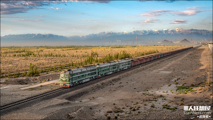 2023年7月。甘肃嘉峪关,三机DF4B牵引货列,沐浴晨光行驶在嘉策铁路上,远处便是高耸连绵的祁连山脉。