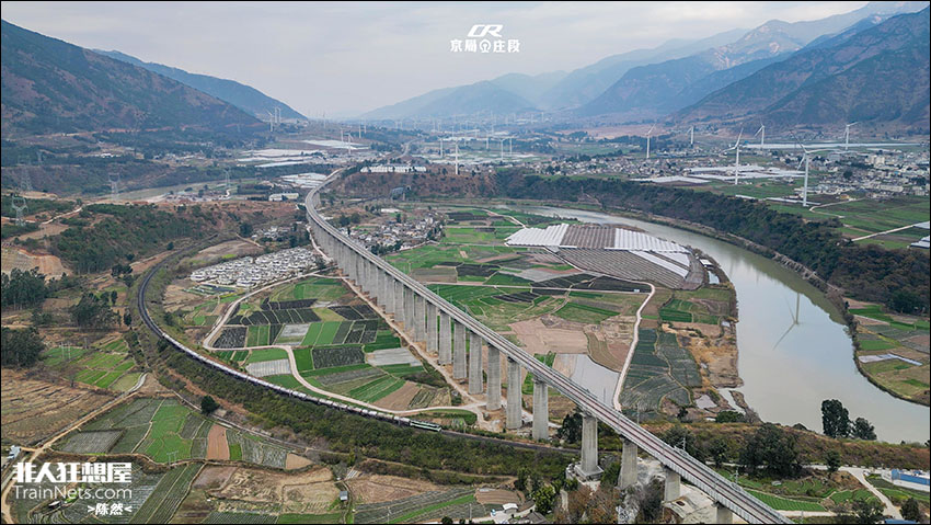 2023年春节,成昆老线SS3小运转驶过风车海中的罗所关弯道,老线与安宁河抱成一圈,新线穿心而过。