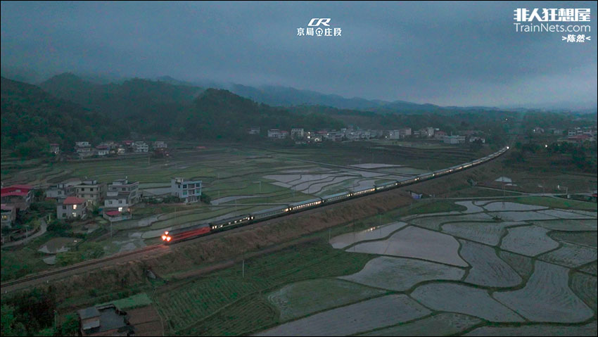 2024年清明,暮色中的邵永橘客K1803次(武昌-湛江)驶过一片水田,接近易江桥站。