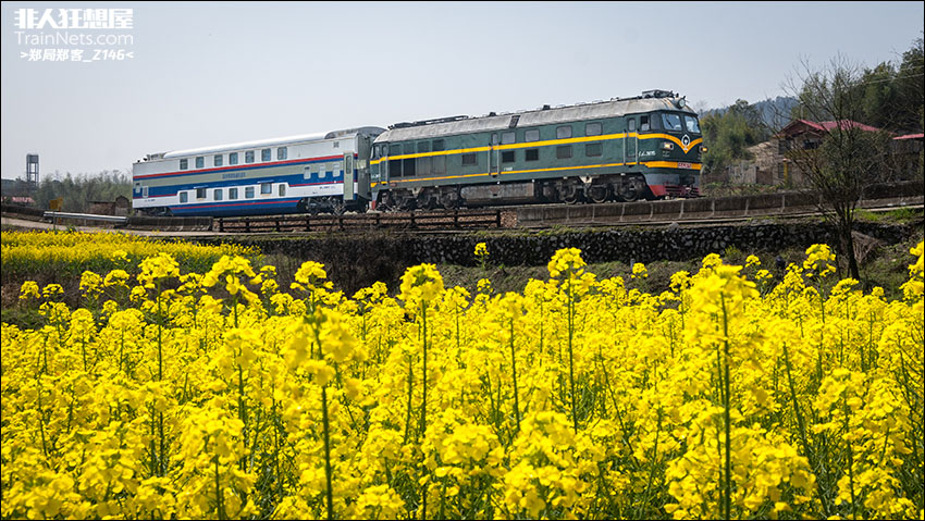 2024年3月,湘桂线,武警牵引双层轨检通过黄羊寺站附近的油菜花田。