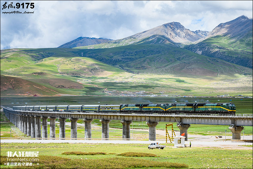 2023年7月26日。西藏当雄。青藏格段NJ2-0063+NJ2-0028+NJ2-0013+NJ2-0036牵引Z9822次列车(拉萨-西宁)行驶在青藏铁路当曲特大桥。