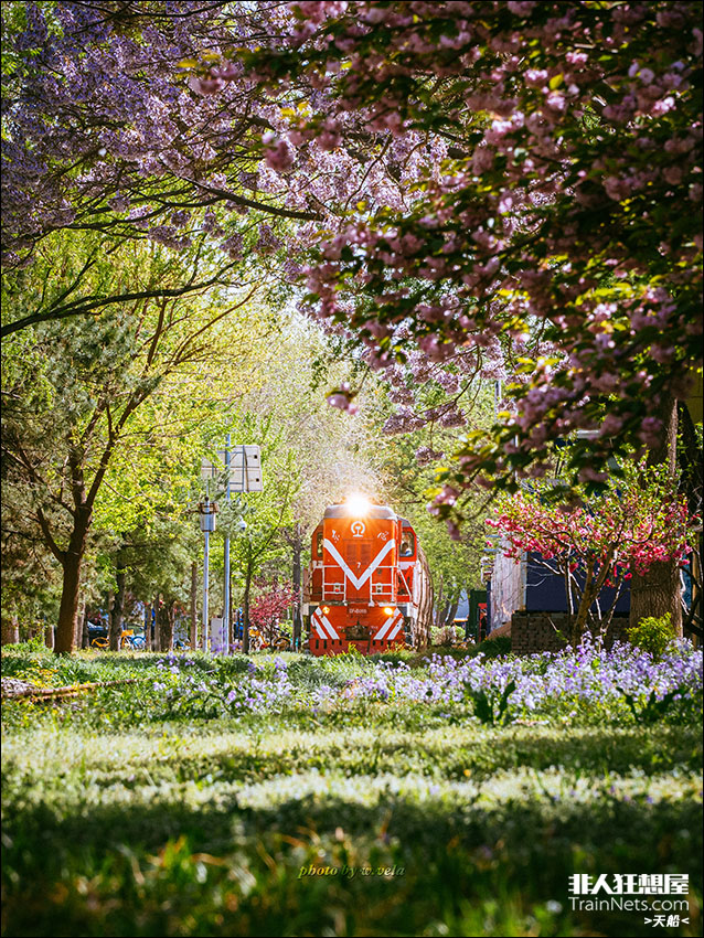 2024年4月,DF7-6055牵引油罐车通过北京西四环四季青附近的京门线。列车行驶在二月兰,泡桐和晚樱的花海之中,吸引了附近很多摄影爱好者前来拍摄。
