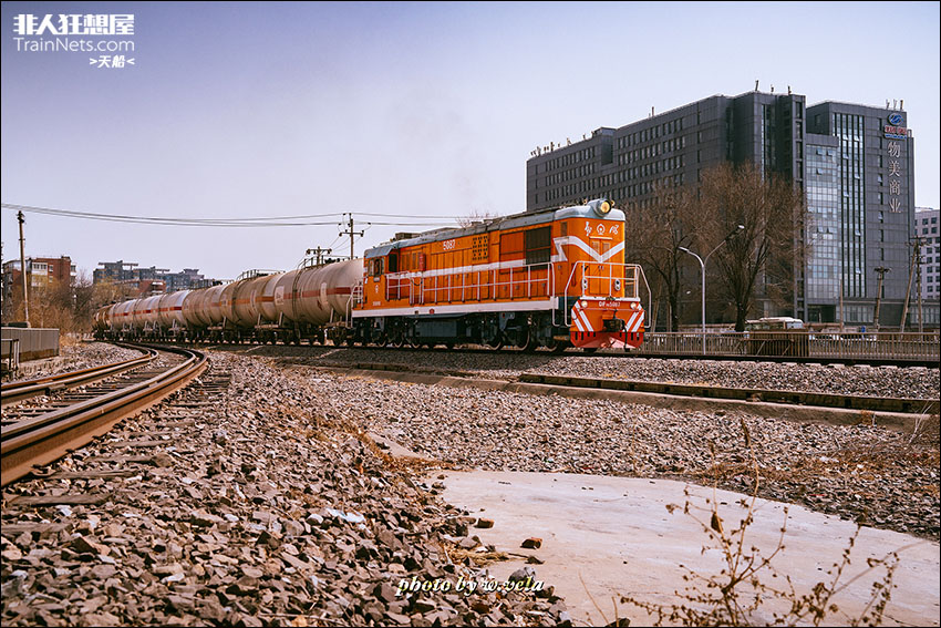 2024年3月,京门线西郊机场送油任务,DF7C-5087 替班“三调机” 牵引油罐车缓缓驶出五路车站。