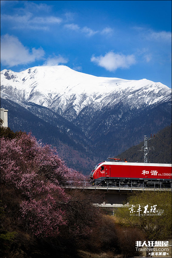 2024年3月,林芝市,HXD1D型机车运行在雪山脚下的桃花源。