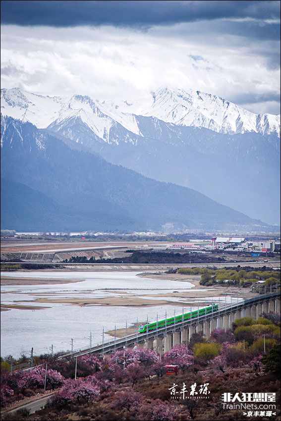 2024年3月,米林市,雅鲁藏布江畔的雪山桃花与CR200JS-G双源动车组。