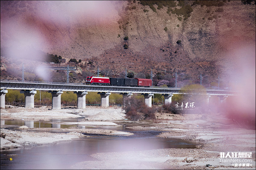 2024年3月,林芝市,桃花丛中拉林铁路特有的HXD1D型机车货运小运转。