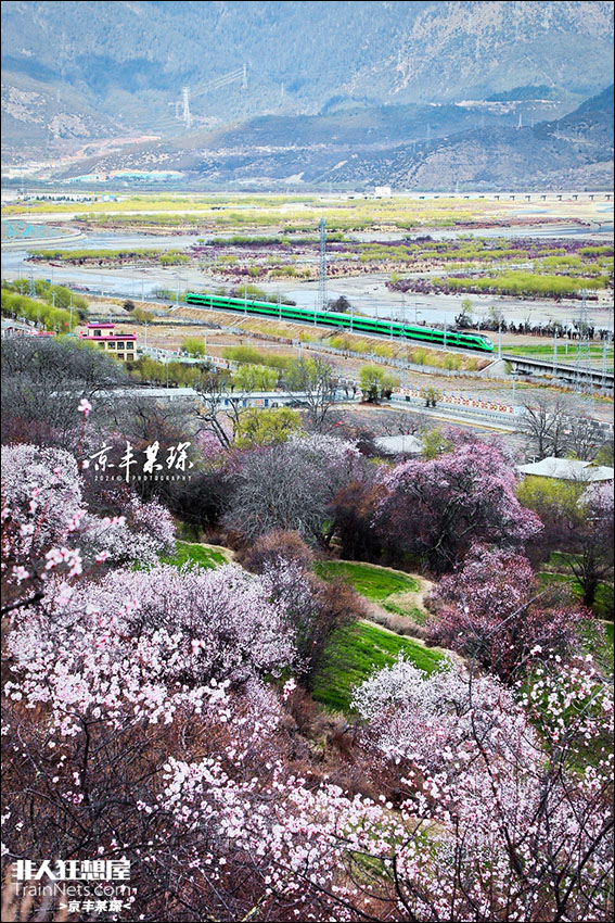 2024年3月,林芝市,工布原乡桃花林与拉林铁路的CR200JS-G双源动车组。