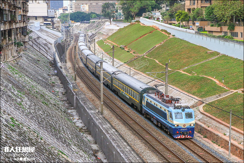 2024年4月13日。广东广州。SS8-0141牵引Z100次列车(广州东-上海)驶过广州城区内的一处S弯,前往广州站方向。