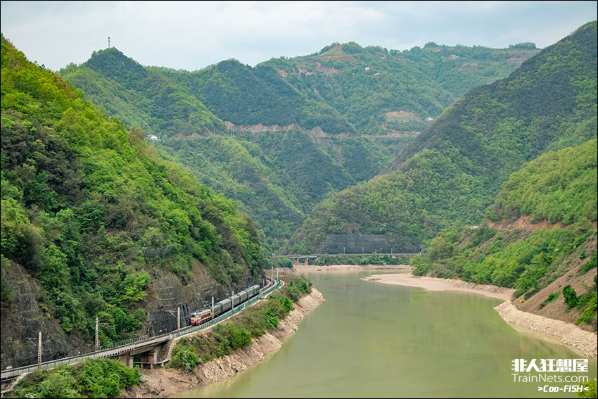 2024年4月13日,陕西略阳,SS7C牵引8363次列车(略阳-汉中)行驶在嘉陵江畔的宝成线上。