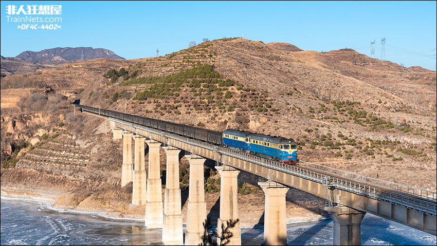 2024年1月,太焦铁路,DF4BD6163+7047双机牵引煤列飞越冰封双峰水库。