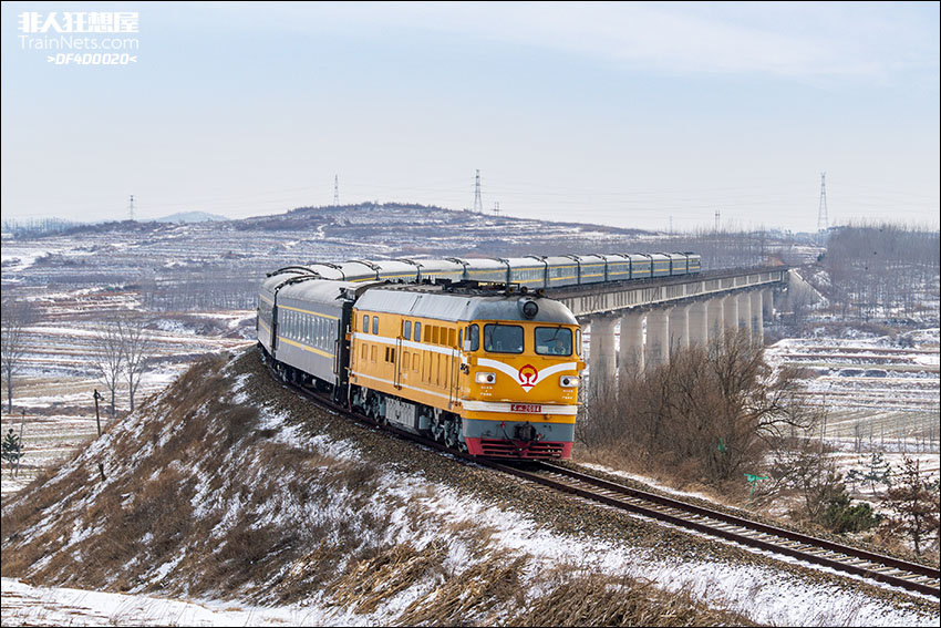 2024年2月。桃威线。黄橘子DF4BK-2684牵引K1066次(威海-武昌)驶出曲水大桥。