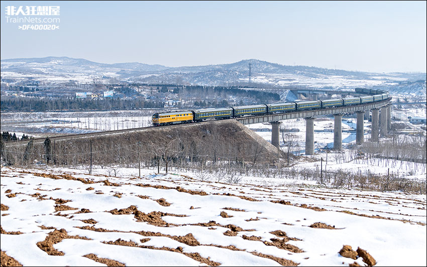 2024年2月。桃威线。雪后,橘客K1066次(威海-武昌)驶过小疃大桥。