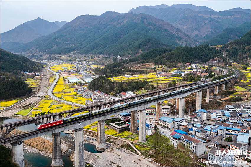 2023年3月12日,宝成上行线,SS7E牵引K197次(成都西-呼和浩特东)行驶在被油菜花包围的清江7号桥。