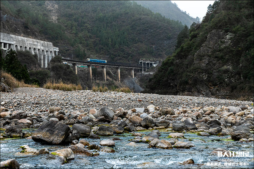 2023年3月12日,绵阳江油,SS4牵引货列行驶在宝成线,春天的潺潺溪水流过铁路旁。