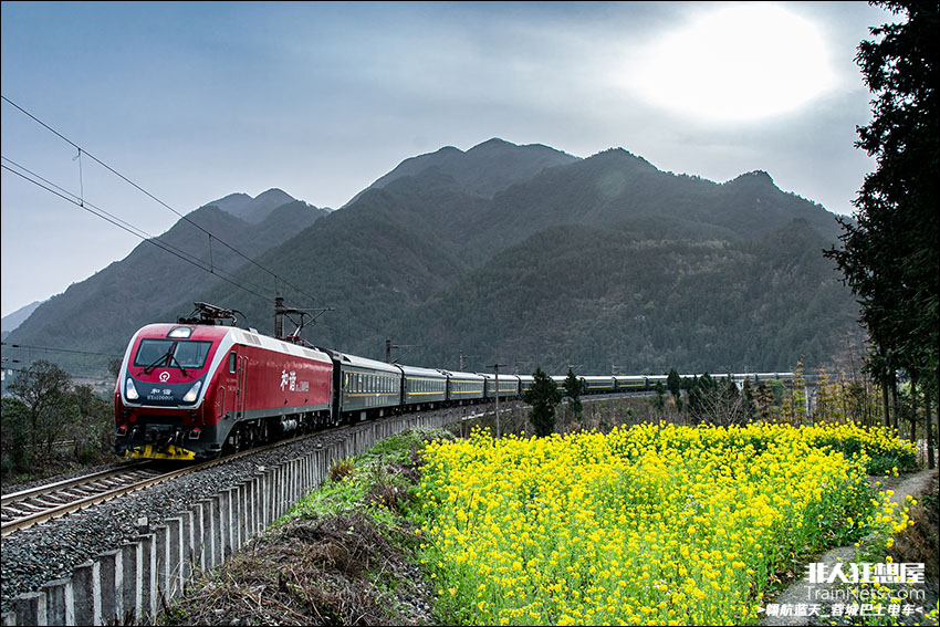 2023年3月12日,绵阳江油,HXD1D-0099牵引K423次(宁波-成都西)行驶在雁门附近,油菜花竞相开放。