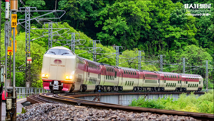 2024年4月30日,伯备线,285系担当寝台特急サンライズ出雲驶上雨后清晨中的第三高梁川桥梁。