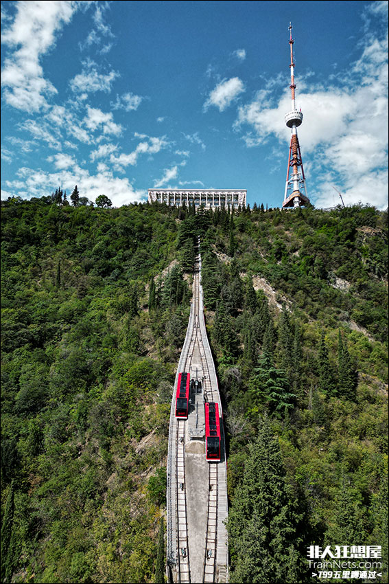 2023年8月17日,第比利斯有轨缆车,上下山的两节车厢交错在半途的车站。