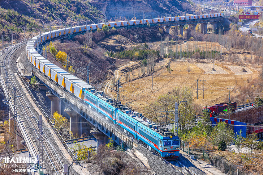 2023年11月3日。国能自备车KM81、KM81A型铝合金煤炭漏斗车混编列车,穿行在陕北的沟壑之中。