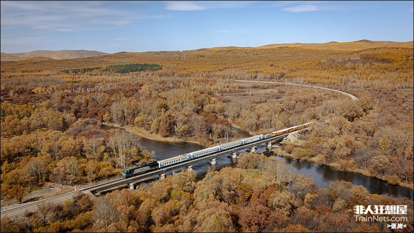 2023年9月,哈局特色天蓝涂装宿营车由HXN5牵引行驶在伊图里河至图里河站间的湿地上。