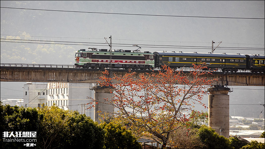 2024年2月底,成局西段SS3-5151“共青团号”机车牵引5634次(攀枝花南-普雄)通过成昆线青杠站外的安宁河5号桥,掠过一棵盛开的“攀枝花”树。
