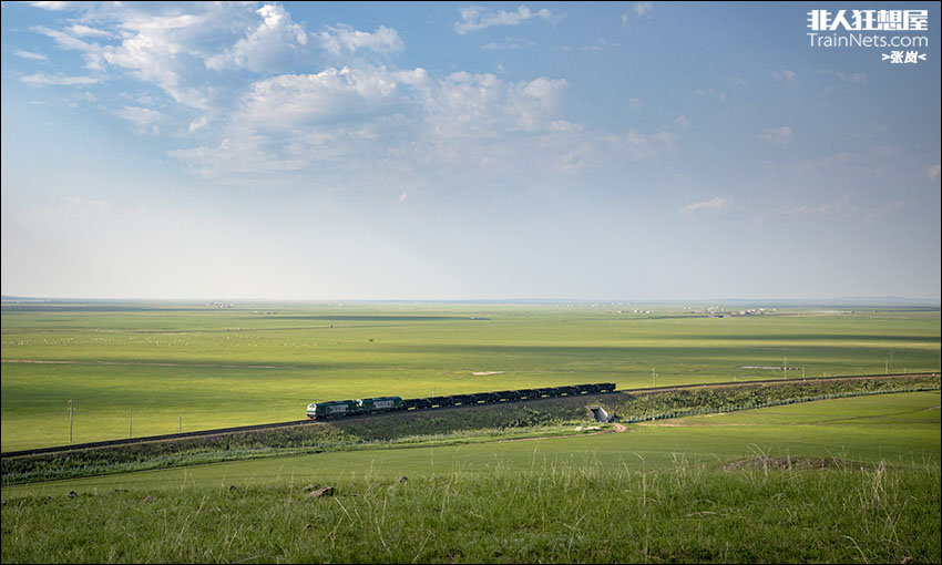 2023年7月,霍白铁路。双机HXN3牵引小运转列车行驶在一望无尽的科尔沁草原上。