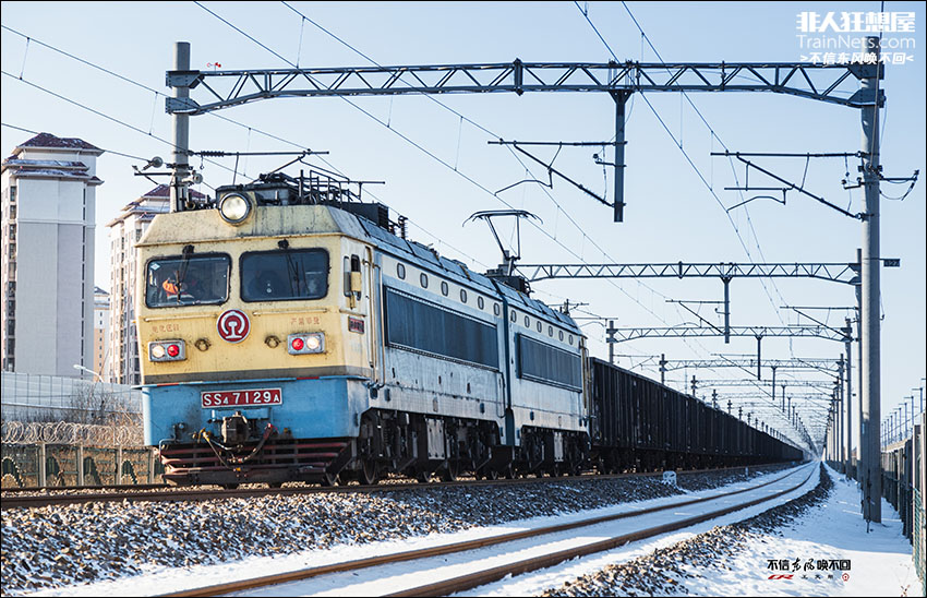 2023年12月,大雪纷飞后,SS4G牵引货列接近京沪线杨村站。