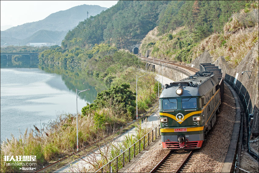 2024年2月13日,广东梅州,梅坎铁路,由“武警”牵引的货列正沿着梅江河奔驰。