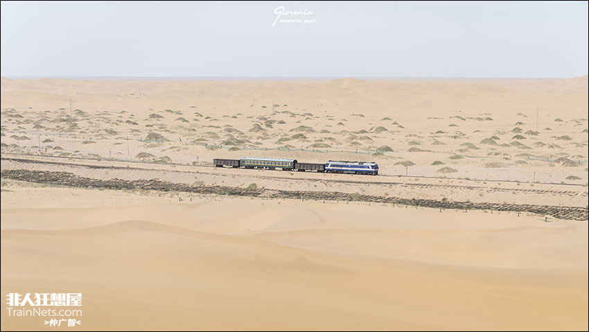 2024年6月10日,吉兰泰通勤车47091次行走在乌兰布和沙漠之中。