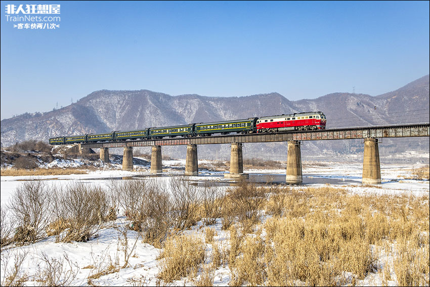 2024年1月26日,DF4D-0556牵引K7507次(沈阳-五女山)行驶在溪田铁路的单边铁桥上。