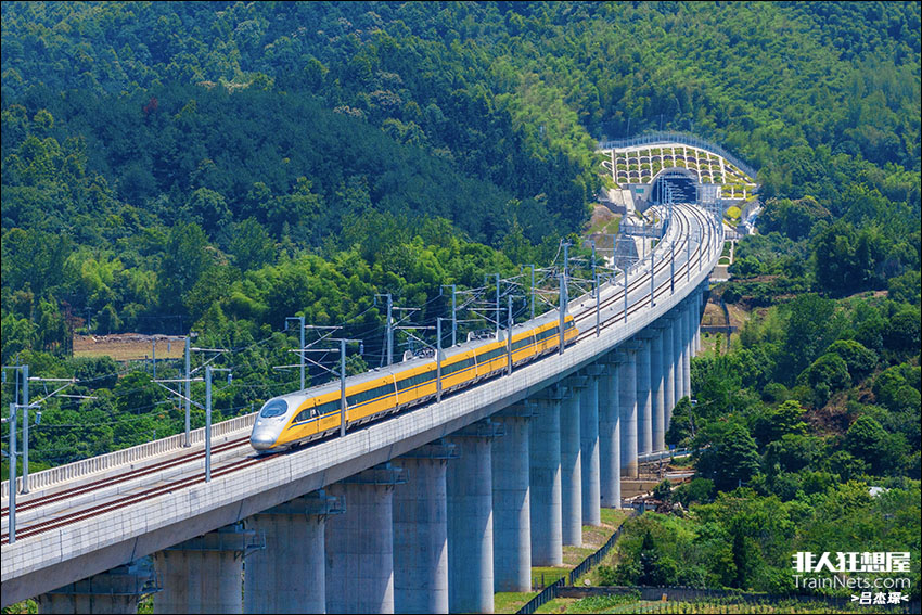 2024年5月28日,担当杭温高铁联调联试任务的CRH380AJ-0201驶出黄杨尖隧道,接近桐庐东站。