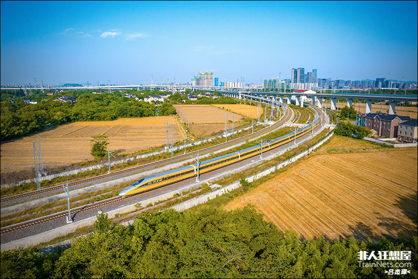 2024年5月28日,结束当日杭温高铁联调联试工作的CRH380AJ-0201由杭州西站经联络线返回杭州西动车运用所,行驶在未来科技城下金色的麦田间。