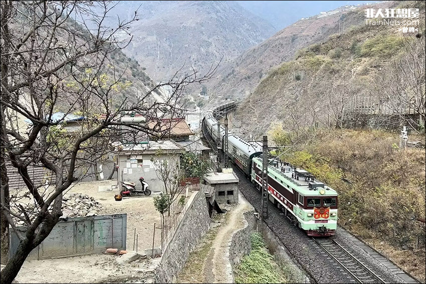 2022年12月。韶山三5151牵引成昆小慢车经过苏雄附近的村庄。