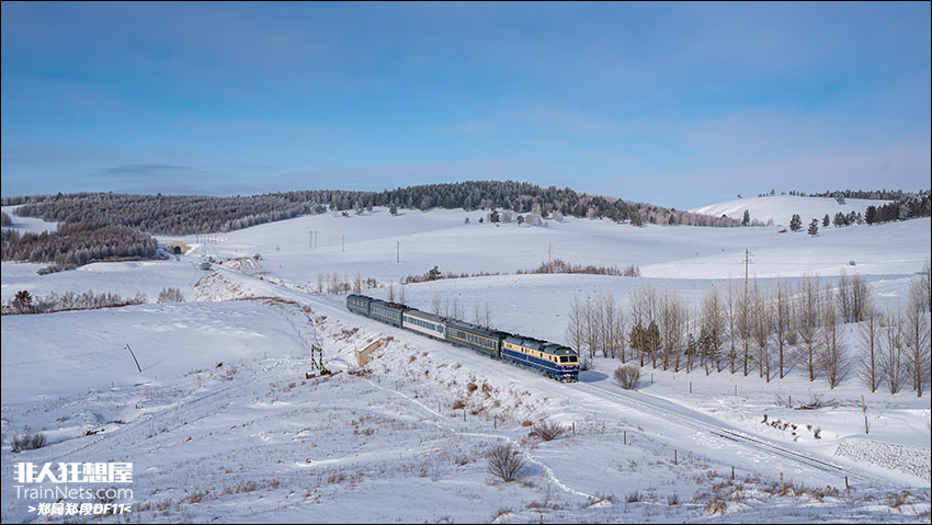 2024年1月,哈局三段DF11牵引两伊线巡检车行驶在罕达盖-杜拉尔区间。
