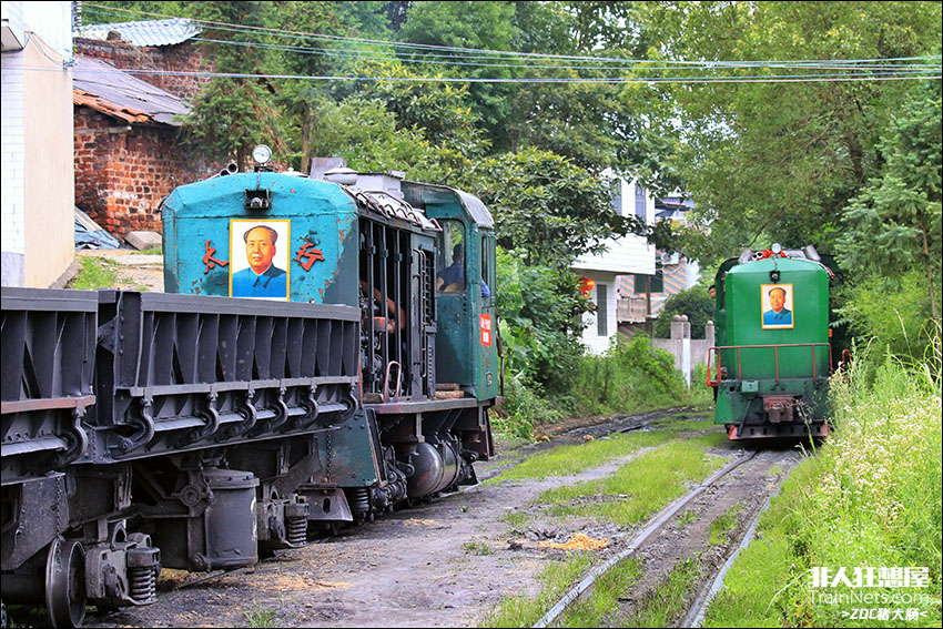 2024年6月30日,马田镇,太行型机车牵引窄轨车在无名车站会车,车身贴的伟人头像形成“新概念毛号”。