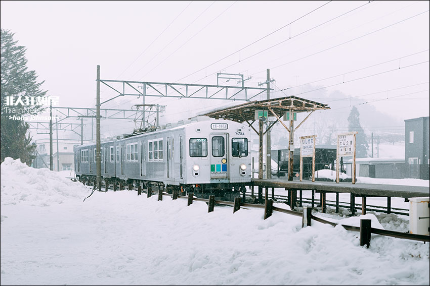 2019年2月7日,青森县弘前市。弘南7000系停靠在石川站。让渡自东急的7000系使用了Budd的车身技术,无涂装的不锈钢原色与白色雪景十分般配。