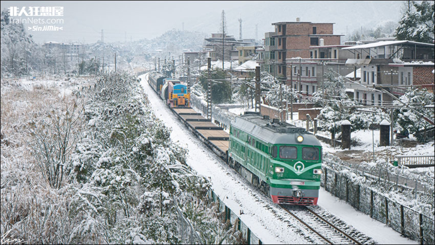 2024年1月,超级超限70007次运送发电机定子缓慢行驶在雪中的沪昆线上