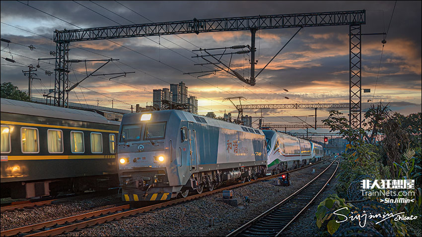 2024年7月,落日时分,57206次回送株厂新造高原动集机车HXD1D-J通过宜春西站,即将在浦镇完成组装上线丽香铁路。