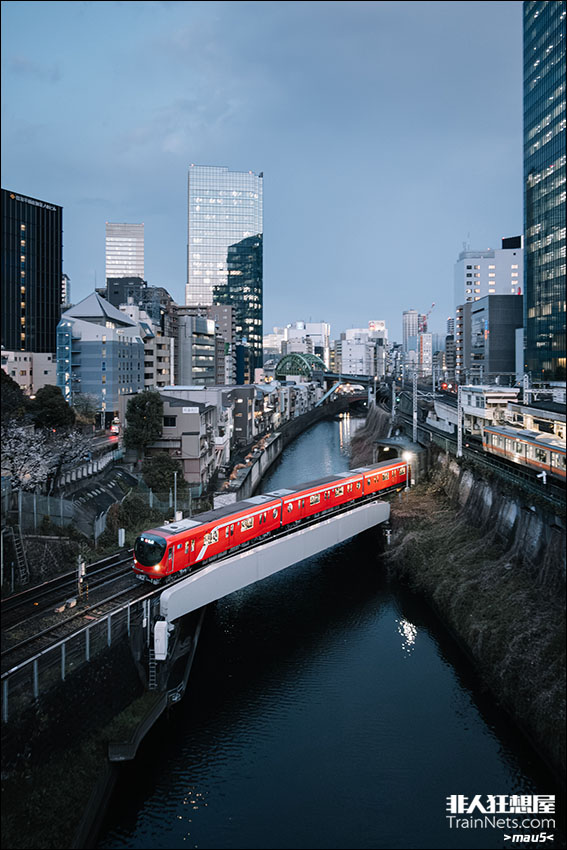 2024年4月。蓝调时刻的圣桥,丸之内线列车正在跨越神田川,右侧是JR御茶之水站。