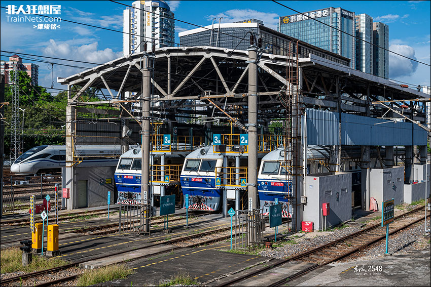 2024年7月。广深线。两台狮子分别单机前往广州东折返段,与前段时间已更换的广州东热备狮子整齐停放于整备棚,形成狮子聚会的场景。